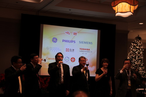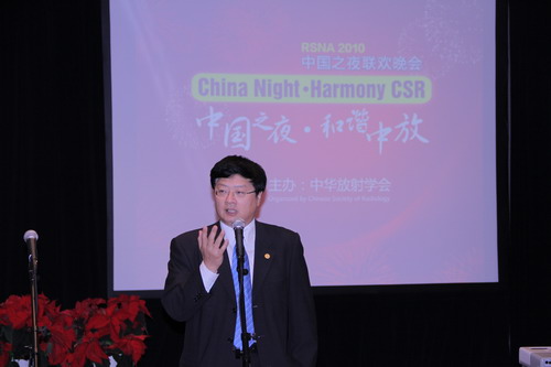 學會主任委員郭啟勇教授、候任主任委員馮曉源教授、各位副主任委員,以及GE、西門子、飛利浦、銳柯等公司的中國區領導悉數出席,中國之夜共吸引了與會專家、公司代表以及在美華人放射專家等400余人參與。致辭中,郭啟勇院長表示,隨著國家經濟的發展,醫療需求的增加,中國的醫療器械市場吸引了世界各地的廣泛關注。而我們的醫療科技水平亦不斷攀升發展,RSNA收錄的中國人論文,從無到有,到今年的176篇,代表著中國影像醫師在RSNA這個世界學術舞臺上的話語權不斷增強,我們已經從旁觀者變成輕舞飛揚的表演者。