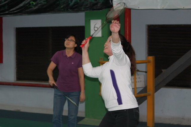球場上,大家放下了工作中的緊張和沉靜,個個活力四射,盡情舒展開來。低頭,發球;輕躍,擊球;騰空,扣球;俯身,拾球。無論男女同事,個個活動開來,面色緋紅,滿身是汗。有單打的,也有雙打的,輕逸的羽毛球就像一只白色的小鳥飛來飛去,一會兒左,一會兒右;一會兒高,一會兒低;一會兒前,一會兒后;同事們的注意力也全集中在了這個白色的小精靈上,仿佛它就是下一個待攻克的技術難關。也有緊張,也有防守,也有反攻,但大家已放松下來,這是一場身心舒緩的運動,所以深受大家的喜愛和歡迎。