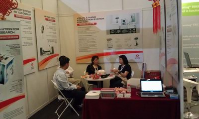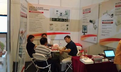 6月的北京正值夏初,剛被一場大雨洗刷過,涼風習習、空氣清新。深圳美德公司一行人行色匆匆,奔赴北京國家會議中心,精心布置展臺,以迎接這難得在祖國大地舉行的盛會。美德公司的展臺別具中國特色,展臺上方懸掛的2個大紅中國結,醒目、溫馨。美德公司一直致力于磁共振專業配套產品,尤其在fMRI研究的相關技術領域具有豐富的資源和經驗,在業界已是久負盛名,許多與會者更是慕名前來參觀,探討合作方向,每天都是座無虛席。