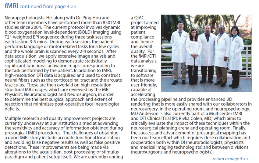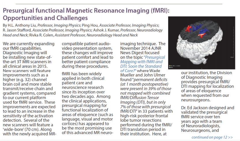 美國MD安德森癌癥中心影像物理學教授劉鶴齡及團隊在MDACC DI newsletter發(fā)表文章,介紹fMRI術(shù)前功能定位在美國臨床應用情況,以及面臨的機遇和挑戰(zhàn)。
